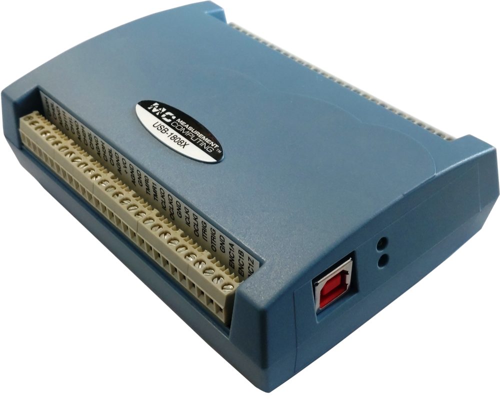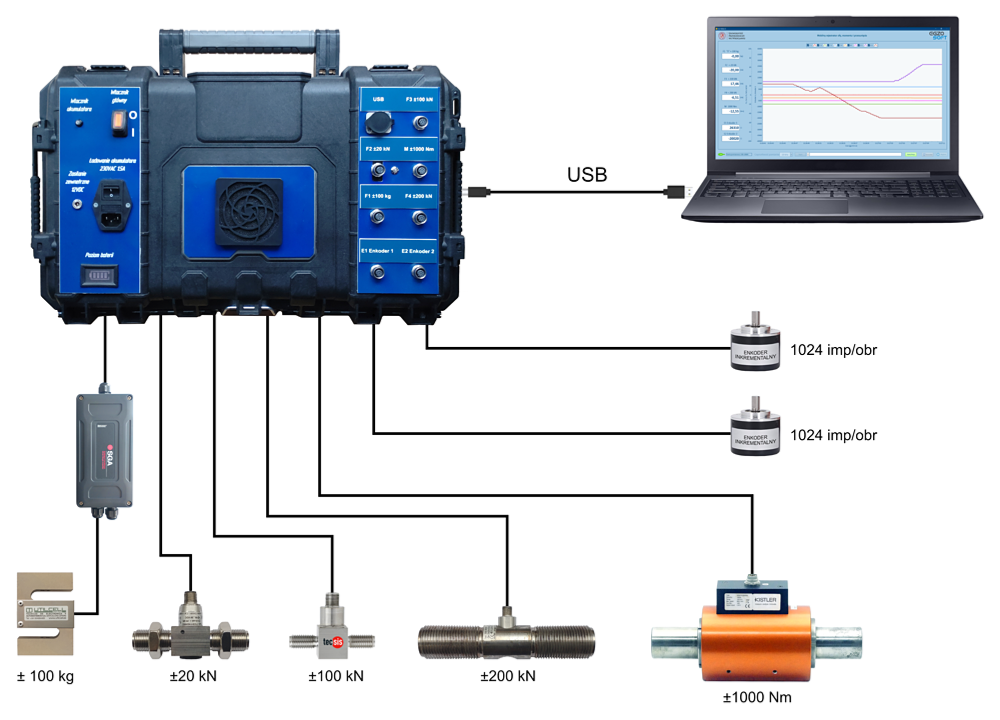 Centralnym elementem mobilnego systemu pomiarowego jest karta akwizycji danych Digilent USB-1808X (ELMARK Automatyka) posiadająca między innymi 8 wejść analogowych i 2 wejścia enkoderowe. Wejścia analogowe obsługują zakresy napięć ±10 V, ±5 V, od 0 do 10 V i od 0 do 5 V i pracują z rozdzielczością 18-bitów oraz częstotliwością próbkowania 200 kS/s na kanał. Wejścia te wykorzystano do równoczesnego podłączenia czujnika tensometrycznego typu „S” +-100kg (Utilcell), trzech siłomierzy +-20 kN, +-100 kN i +-200 kN (Tecsis) i momentomierza +-1000 Nm (Kistler). Dwa wejścia enkoderowe standardu TTL pozwalają z kolei na współpracę z enkoderami kwadraturowymi działającymi z maksymalną częstotliwością do 50 MHz i trybami zliczania X1, X2 i X4. Do wejść enkoderowych podłączono dwa enkodery inkrementalne MOK40-1024-5-BZ-N (WObit) generujące 1024 impulsy na obrót. Kupując kartę pomiarową USB-1808X otrzymujemy także sterowniki do najpopularniejszych języków programowania (między innymi do LabVIEW).