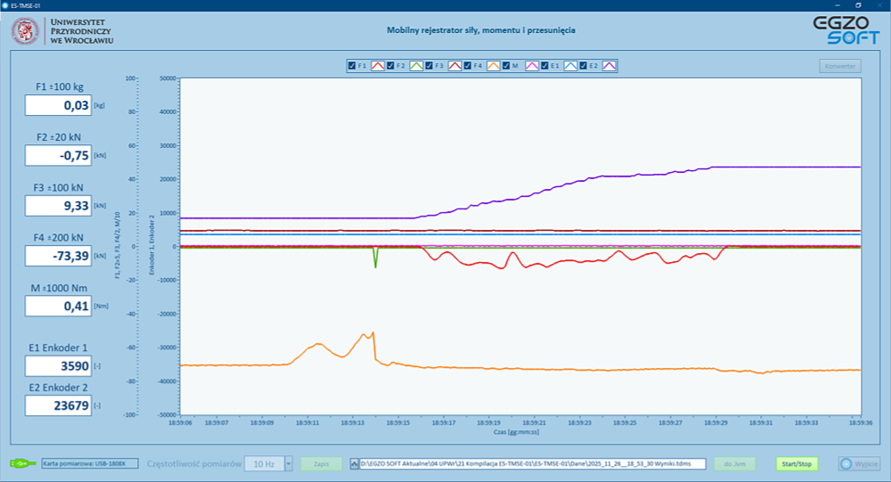 Oprogramowanie do mobilnego systemu pomiarowego pozwala na monitorowanie, wizualizację i zapisywanie wyników uzyskanych w trakcie eksperymentów naukowych. Panel po lewej stronie ekranu służy do wyświetlania wyników pomiarów w formie liczbowej z dokładnością do dwóch miejsc po przecinku (za wyjątkiem enkoderów). Prawą stronę ekranu zajmuje wykres na którym wizualizowane są zmiany wartości monitorowanych parametrów w czasie badań (ostatnie trzydzieści sekund). Wykres posiada dwie oddzielne osie pionowe. Na pierwszej osi opisanej „Enkoder 1, Enkoder 2” prezentowane są wskazania enkoderów w zakresie od -50 000 do 50 000 impulsów. Druga oś jest wyskalowana w zakresie od -100 do 100. Aby zmieścić wskazania ze wszystkich czujników, które mogą być podłączone do mobilnego rejestratora, wyniki pomiarów z czujników przed umieszczeniem na wykresie podlegają przeskalowaniu (F1×1, F2×5, F3×1, F4/2, M/10). Rzeczywiste wyniki pomiarów (bez skalowania) są wyświetlane w formie liczbowej i zapisywane do pliku. Ponad wykresem znajduje się obszar legendy, w którym za pomocą pól wyboru (checkbox) operator może zdecydować, które z monitorowanych parametrów mają być wyświetlane w danym momencie na wykresie. Funkcja ta jest przydatna na przykład wtedy, gdy nie wszystkie czujniki są podłączone do układu pomiarowego.