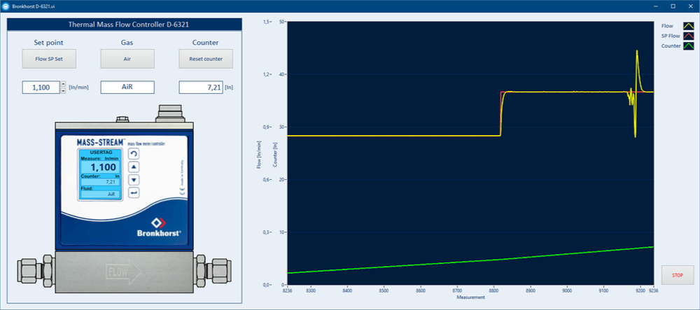 Podstawowa wersja oprogramowania współpracującego z masowym regulatorem przepływu pozwala na manualną zmianę wartości zadanej przepływu (Set point), przełączenie charakterystyki aktualnie przepływającego gazu (powietrze, ditlenek węgla) i resetowanie licznika przepływu (Counter). Na wykresie można obserwować przebieg aktualnie zmierzonej wartości przepływu, wartość zadaną przepływu gazu oraz przebieg wartości licznika przepływu gazu.